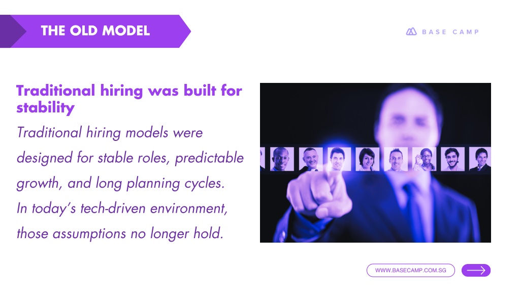 THE OLD MODEL Traditional hiring was built for stability Traditional hiring models were designed for stable roles, predictable growth, and long planning cycles. In today’s tech-driven environment, those assumptions no longer hold. WWW.BASECAMP.COM.SG