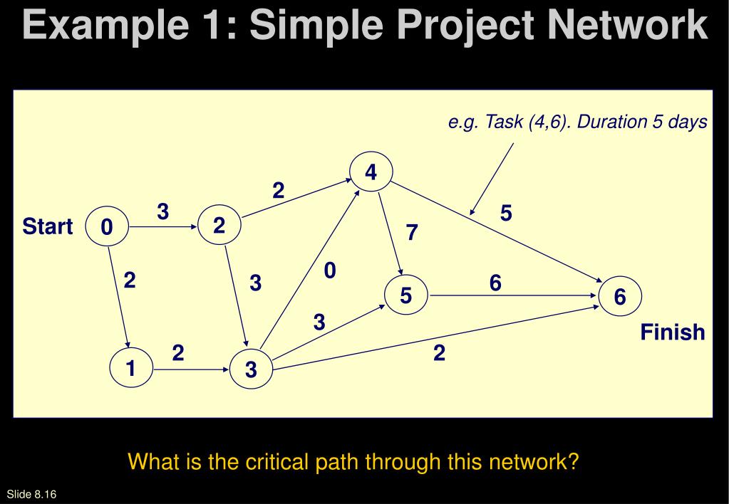 e.g. Task (4,6). Duration 5 days 4 2 3 5 2 0 Start 7 0 2 3 6 5 6 3 Finish 2 2 1 3 Example 1: Simple Project Network What is the critical path through this network?