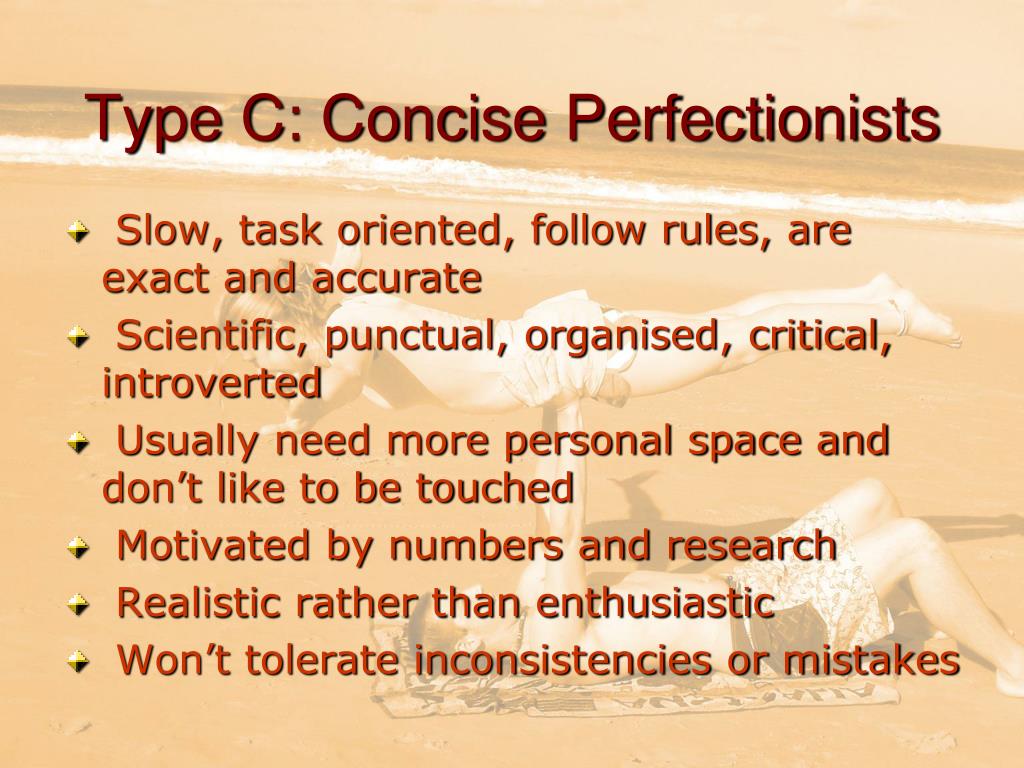 Type C: Concise Perfectionists • Slow, task oriented, follow rules, are exact and accurate • Scientific, punctual, organised, critical, introverted • Usually need more personal space and don’t like to be touched • Motivated by numbers and research • Realistic rather than enthusiastic • Won’t tolerate inconsistencies or mistakes