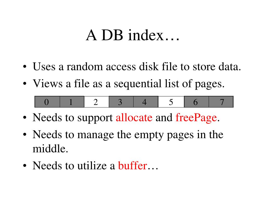 1 2 3 4 5 A DB index… • Uses a random access disk file to store data. • Views a file as a sequential list of pages. • Needs to support allocate and freePage. • Needs to manage the empty pages in the middle. • Needs to utilize a buffer… 0 6 7