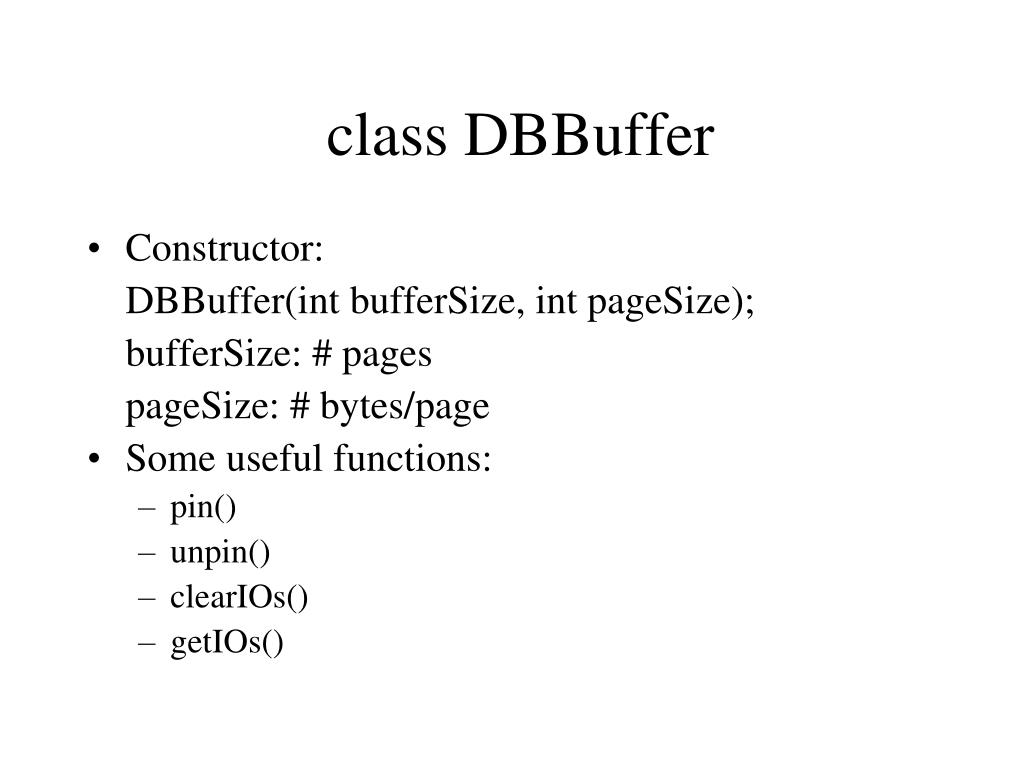 class DBBuffer • Constructor: DBBuffer(int bufferSize, int pageSize); bufferSize: # pages pageSize: # bytes/page • Some useful functions: • pin() • unpin() • clearIOs() • getIOs()