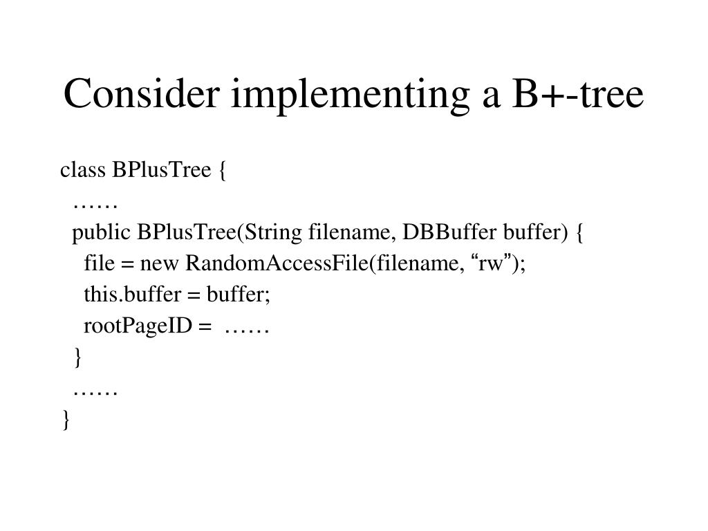 Consider implementing a B+-tree class BPlusTree { …… public BPlusTree(String filename, DBBuffer buffer) { file = new RandomAccessFile(filename, “rw”); this.buffer = buffer; rootPageID = …… } …… }