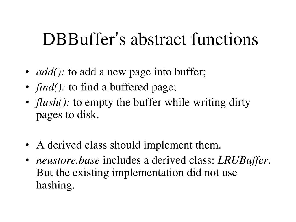DBBuffer’s abstract functions • add(): to add a new page into buffer; • find(): to find a buffered page; • flush(): to empty the buffer while writing dirty pages to disk. • A derived class should implement them. • neustore.base includes a derived class: LRUBuffer. But the existing implementation did not use hashing.