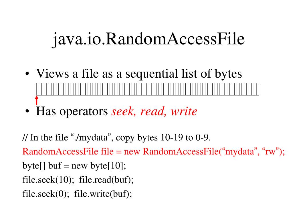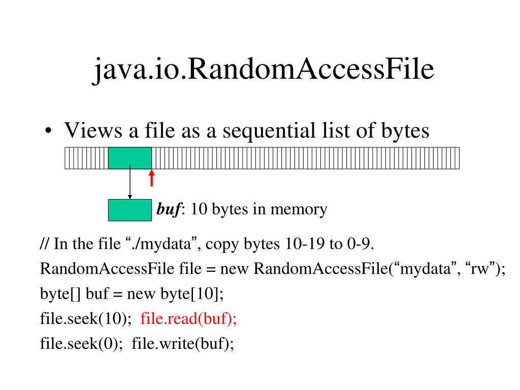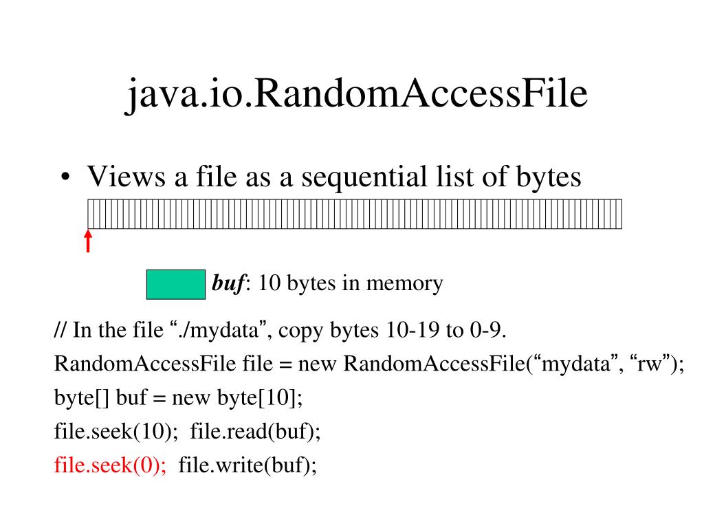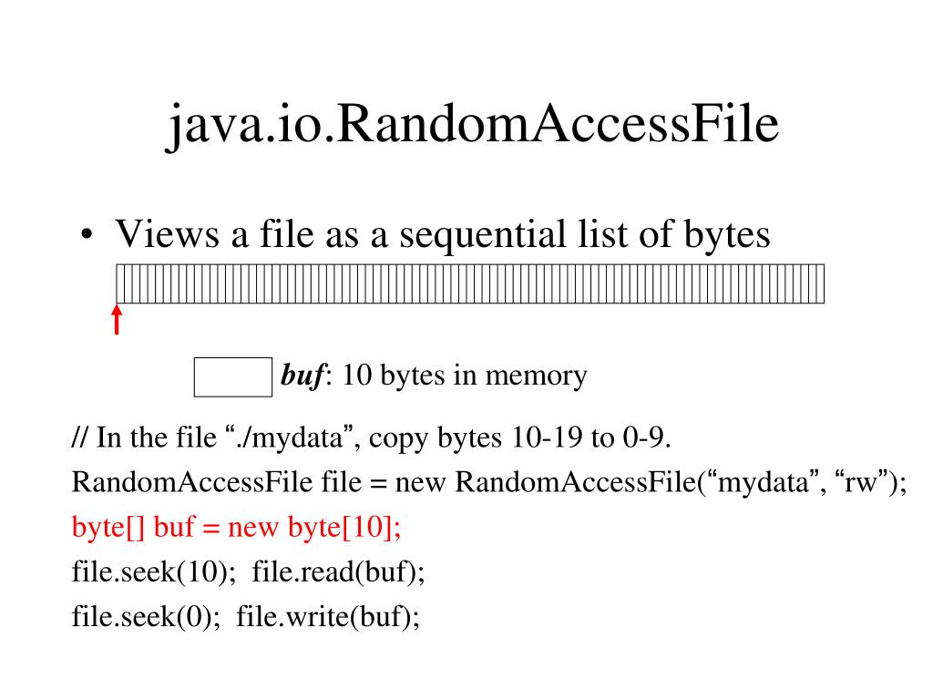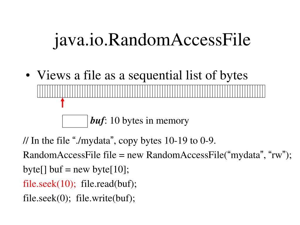 java.io.RandomAccessFile • Views a file as a sequential list of bytes buf: 10 bytes in memory // In the file “./mydata”, copy bytes 10-19 to 0-9. RandomAccessFile file = new RandomAccessFile(“mydata”, “rw”); byte[] buf = new byte[10]; file.seek(10); file.read(buf); file.seek(0); file.write(buf);
