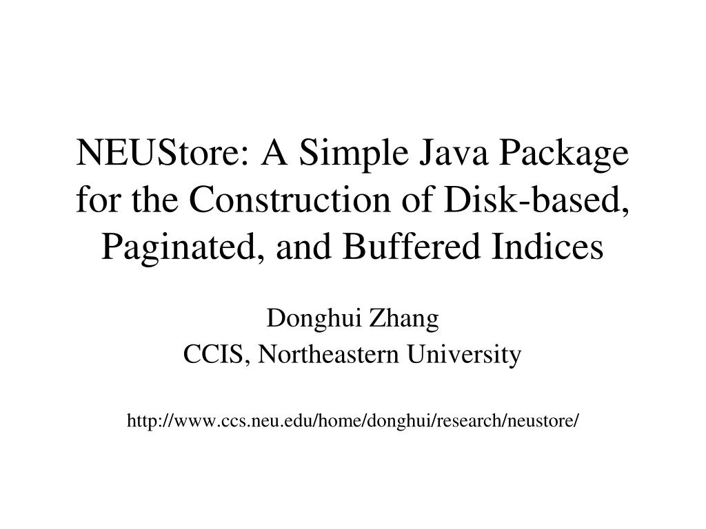 NEUStore: A Simple Java Package for the Construction of Disk-based, Paginated, and Buffered Indices. Donghui Zhang CCIS, Northeastern University http://www.ccs.neu.edu/home/donghui/research/neustore/. A DB index should be stored as a disk file. Let ’ s check what Java.io.RandomAccessFile