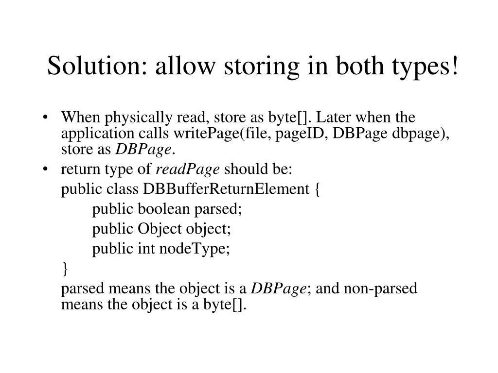 Solution: allow storing in both types! • When physically read, store as byte[]. Later when the application calls writePage(file, pageID, DBPage dbpage), store as DBPage. • return type of readPage should be: public class DBBufferReturnElement { public boolean parsed; public Object object; public int nodeType; } parsed means the object is a DBPage; and non-parsed means the object is a byte[].