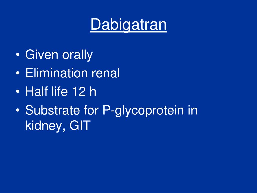 Dabigatran • Given orally • Elimination renal • Half life 12 h • Substrate for P-glycoprotein in kidney, GIT