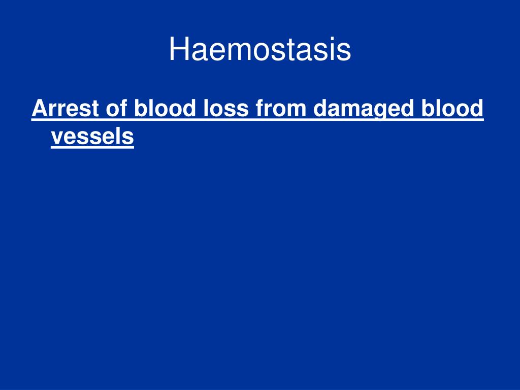 Haemostasis Arrest of blood loss from damaged blood vessels