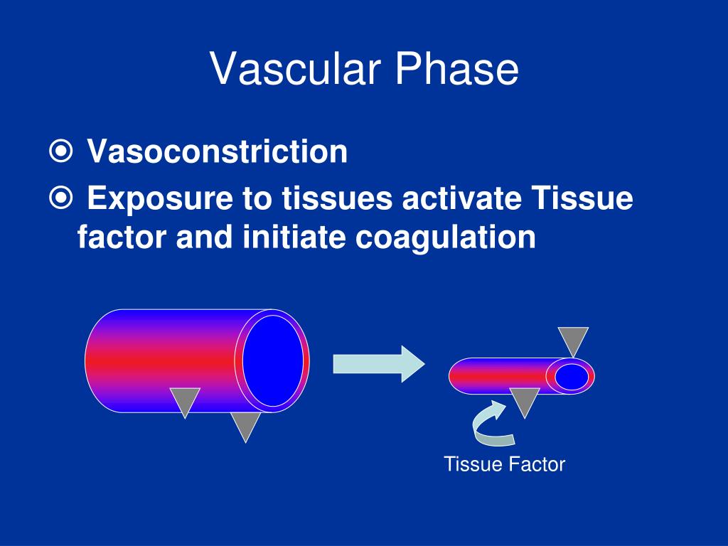 Vascular Phase • Vasoconstriction • Exposure to tissues activateTissue factor and initiate coagulation Tissue Factor