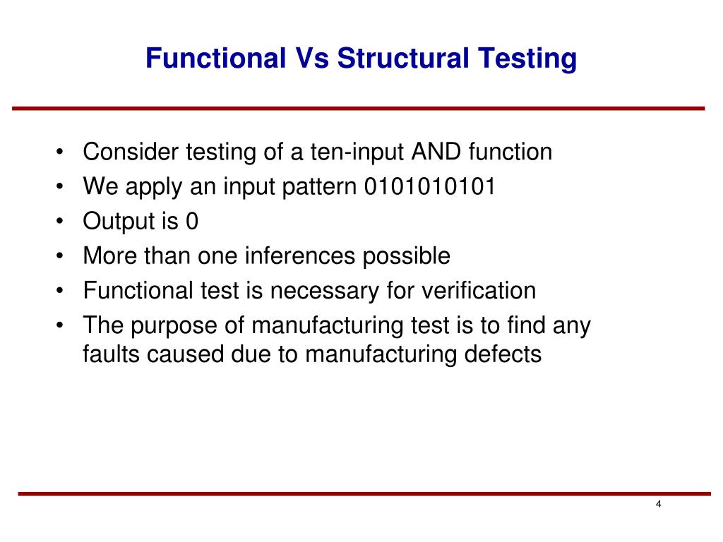Functional Vs Structural Testing • Consider testing of a ten-input AND function • We apply an input pattern 0101010101 • Output is 0 • More than one inferences possible • Functional test is necessary for verification • The purpose of manufacturing test is to find any faults caused due to manufacturing defects