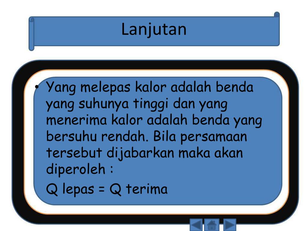 Lanjutan • Yang melepaskaloradalahbenda yang suhunyatinggidan yang menerimakaloradalahbenda yang bersuhurendah. Bilapersamaantersebutdijabarkanmakaakandiperoleh : Q lepas = Q terima