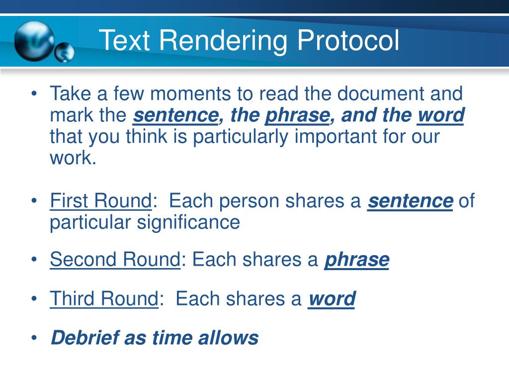 Text Rendering Protocol • Take a few moments to read the document and mark the sentence, the phrase, and the word that you think is particularly important for our work. • First Round: Each person shares a sentence of particular significance • Second Round: Each shares a phrase • Third Round: Each shares a word • Debrief as time allows