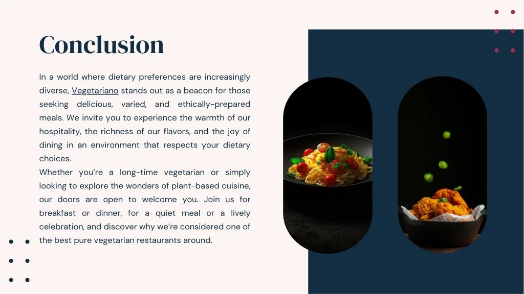 Conclusion In a world where dietary preferences are increasingly diverse, Vegetariano stands out as a beacon for those seeking delicious, varied, and ethically-prepared meals. We invite you to experience the warmth of our hospitality, the richness of our flavors, and the joy of dining in an environment that respects your dietary choices. Whether you’re a long-time vegetarian or simply looking to explore the wonders of plant-based cuisine, our doors are open to welcome you. Join us for breakfast or dinner, for a quiet meal or a lively celebration, and discover why we’re considered one of the best pure vegetarian restaurants around.