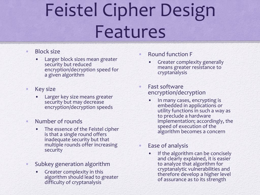 Feistel Cipher Design Features • Block size • Larger block sizes mean greater security but reduced encryption/decryption speed for a given algorithm • Key size • Larger key size means greater security but may decrease encryption/decryption speeds • Number of rounds • The essence of the Feistel cipher is that a single round offers inadequate security but that multiple rounds offer increasing security • Subkey generation algorithm • Greater complexity in this algorithm should lead to greater difficulty of cryptanalysis • Round function F • Greater complexity generally means greater resistance to cryptanalysis • Fast software encryption/decryption • In many cases, encrypting is embedded in applications or utility functions in such a way as to preclude a hardware implementation; accordingly, the speed of execution of the algorithm becomes a concern • Ease of analysis • If the algorithm can be concisely and clearly explained, it is easier to analyze that algorithm for cryptanalytic vulnerabilities and therefore develop a higher level of assurance as to its strength