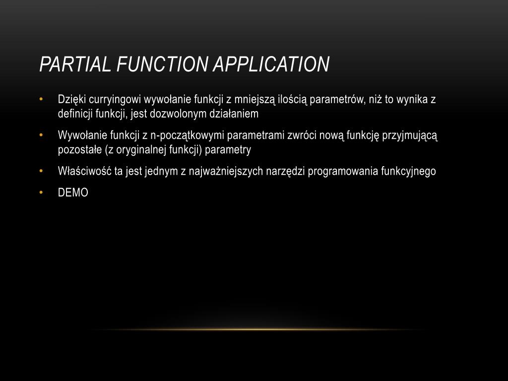 Partialfunctionapplication • Dzięki curryingowiwywołanie funkcji z mniejszą ilością parametrów, niż to wynika z definicji funkcji, jest dozwolonym działaniem • Wywołanie funkcji z n-początkowymi parametrami zwróci nową funkcję przyjmującą pozostałe (z oryginalnej funkcji) parametry • Właściwość ta jest jednym z najważniejszych narzędzi programowania funkcyjnego • DEMO