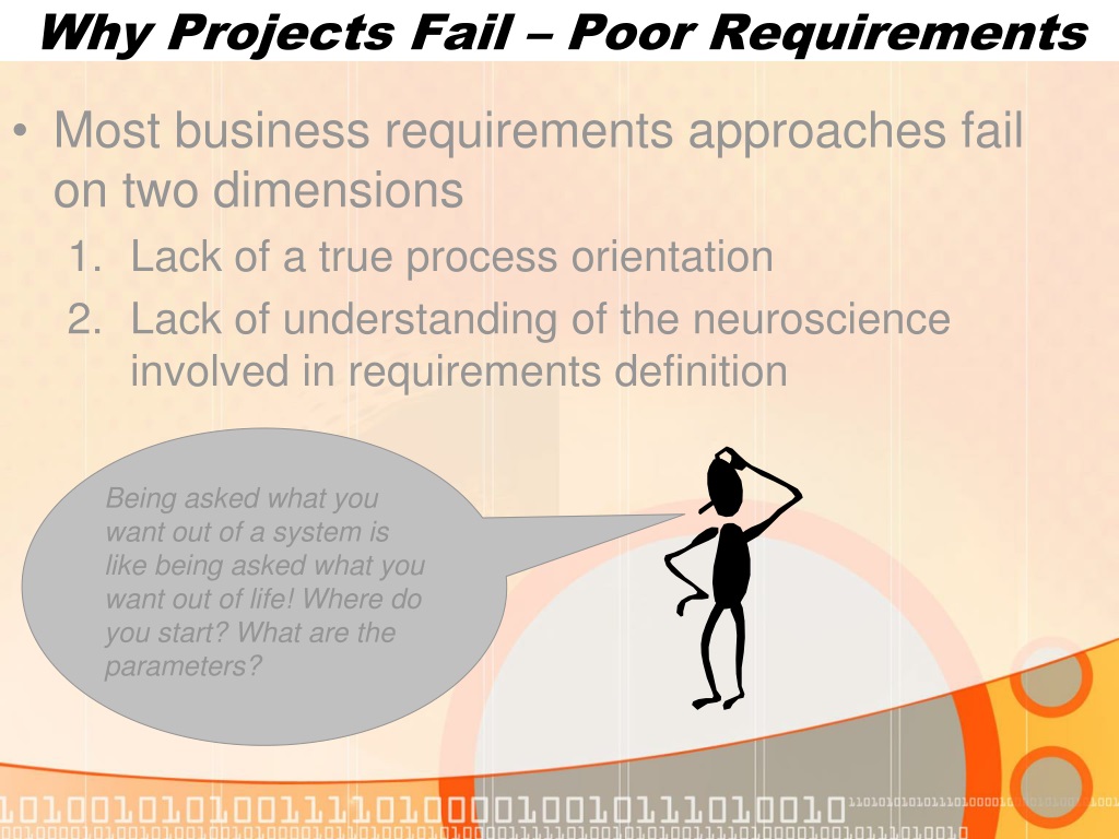 Why Projects Fail – Poor Requirements • Most business requirements approaches fail on two dimensions • Lack of a true process orientation • Lack of understanding of the neuroscience involved in requirements definition • Being asked what you want out of a system is like being asked what you want out of life! Where do you start? What are the parameters?