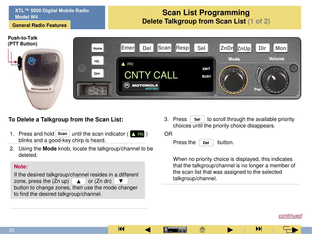 Scan List ProgrammingDelete Talkgroup from Scan List (1 of 2) General Radio Features ▲ PRI ▲ N PRI CNTY CALL To Delete a Talkgroup from the Scan List: • Press to scroll through the available priority choices until the priority choice disappears. • OR • Press the button. • When no priority choice is displayed, this indicates that the talkgroup/channel is no longer a member of the scan list that was assigned to the selected talkgroup/channel. Sel • Press and hold until the scan indicator ( ) blinks and a good-key chirp is heard. • Using the Mode knob, locate the talkgroup/channel to be deleted. Scan ▲ PRI Del Note: If the desired talkgroup/channel resides in a different zone, press the (Zn up) or (Zn dn) button to change zones, then use the mode changer to find the desired talkgroup/channel. ▼ ▲ continued