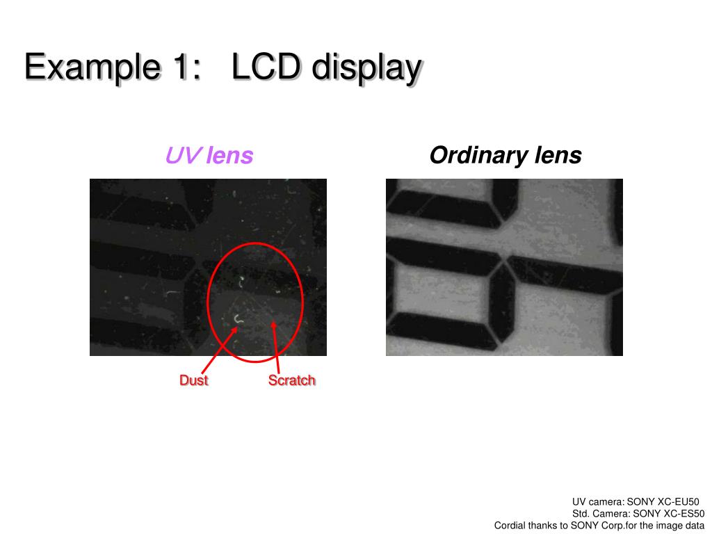 Example 1: LCD display UV lens Ordinary lens Dust Scratch UV camera: SONY XC-EU50 Std. Camera: SONY XC-ES50 Cordial thanks to SONY Corp.for the image data