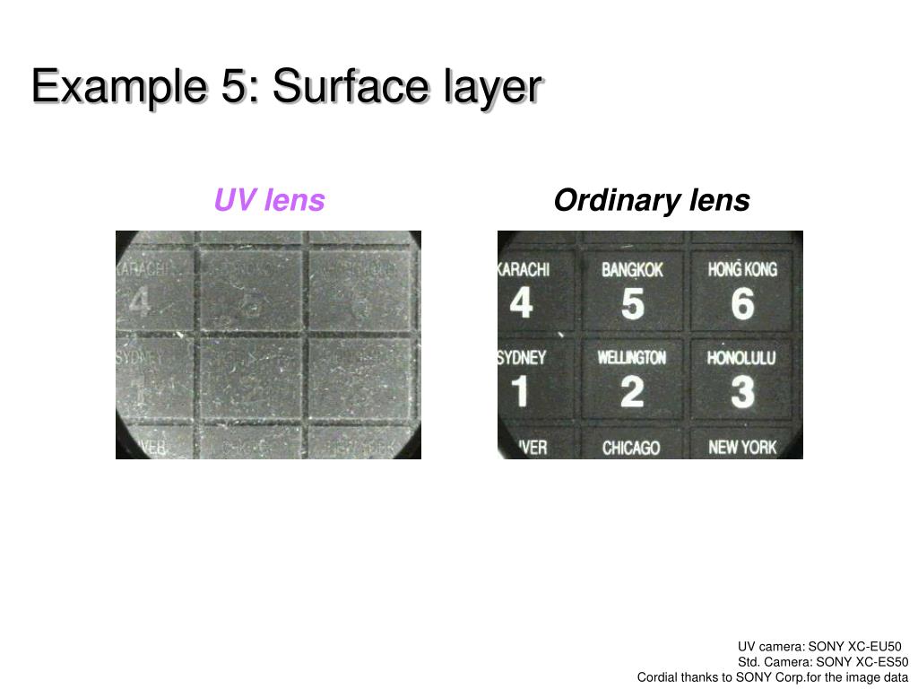 Example 5: Surface layer UV lens Ordinary lens UV camera: SONY XC-EU50 Std. Camera: SONY XC-ES50 Cordial thanks to SONY Corp.for the image data