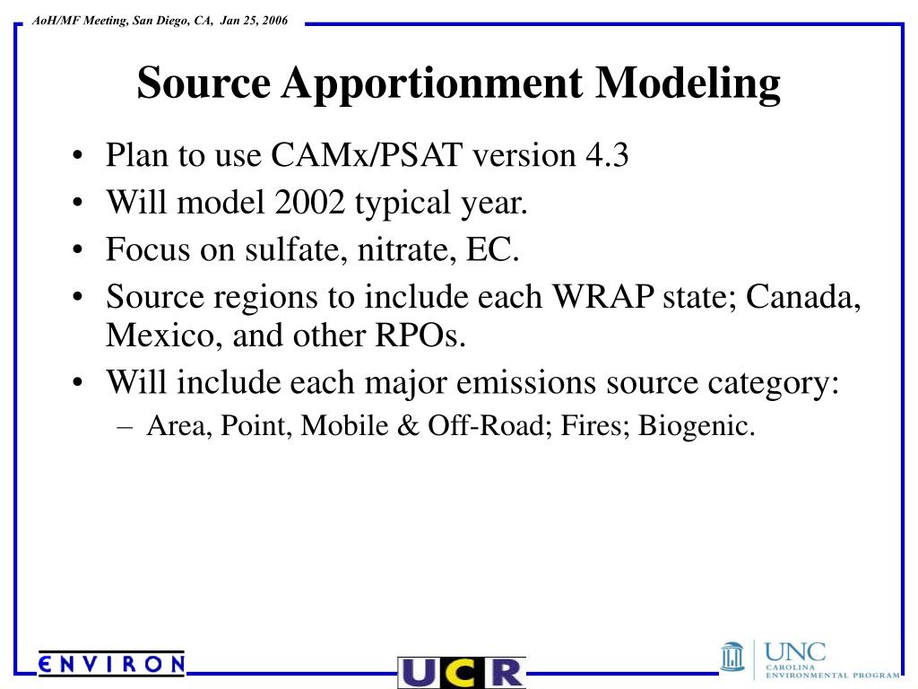 Plan to use CAMx/PSAT version 4.3 Will model 2002 typical year. Focus on sulfate, nitrate, EC. Source regions to include each WRAP state; Canada, Mexico, and other RPOs. Will include each major emissions source category: Area, Point, Mobile & Off-Road; Fires; Biogenic. Source Apportionment Modeling