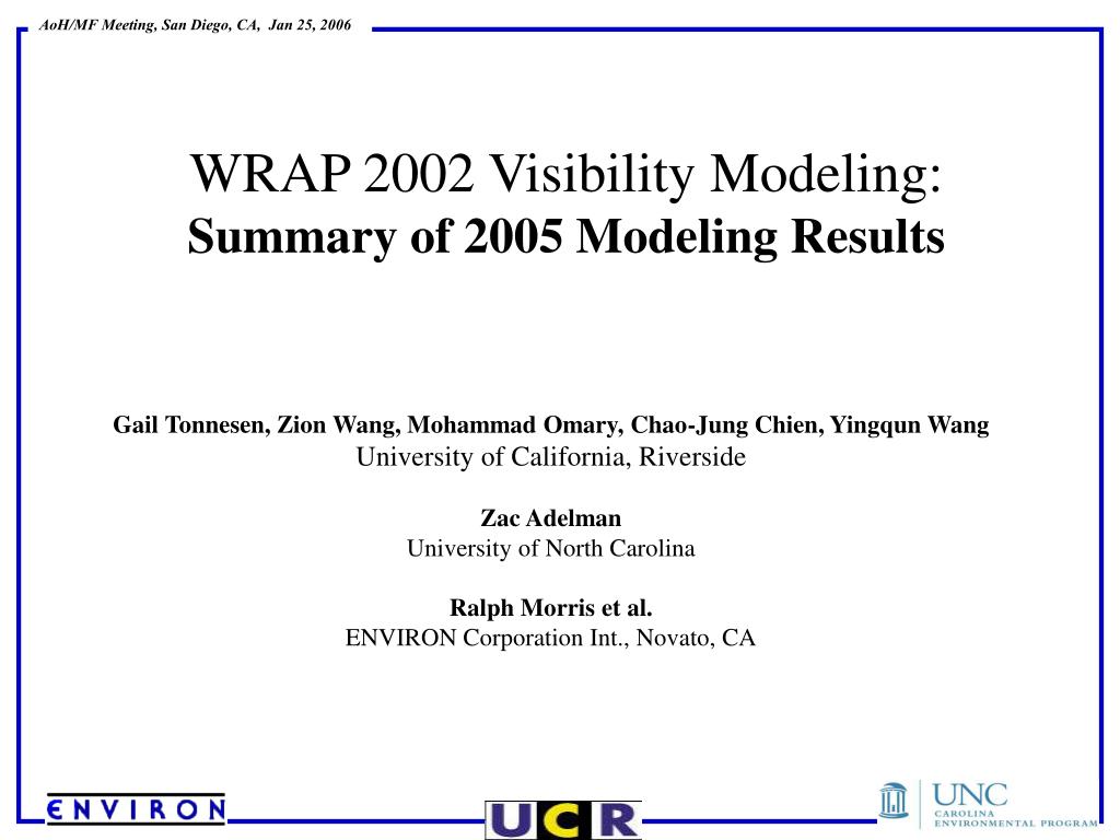 WRAP 2002 Visibility Modeling:Summary of 2005 Modeling Results Gail Tonnesen, Zion Wang, Mohammad Omary, Chao-Jung Chien, Yingqun Wang University of California, Riverside Zac Adelman University of North Carolina Ralph Morris et al. ENVIRON Corporation Int., Novato, CA