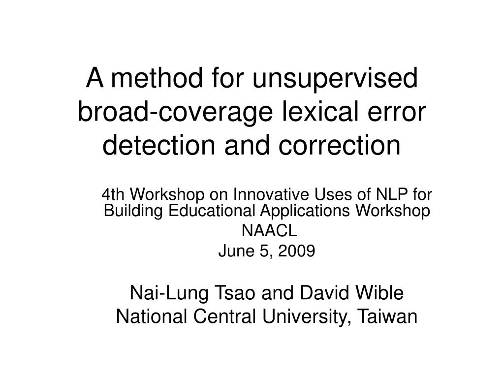 A method for unsupervised broad-coverage lexical error detection and correction 4th Workshop on Innovative Uses of NLP for Building Educational Applications Workshop NAACL June 5, 2009 Nai-Lung Tsao and David Wible National Central University, Taiwan