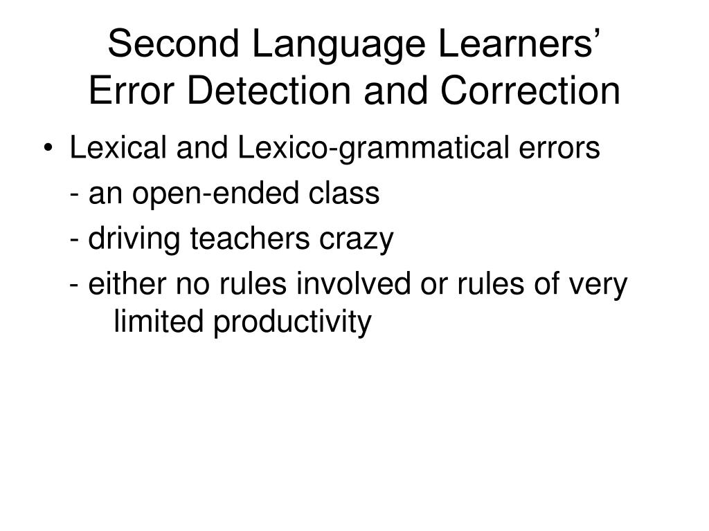 Second Language Learners’Error Detection and Correction • Lexical and Lexico-grammatical errors - an open-ended class - driving teachers crazy - either no rules involved or rules of very limited productivity