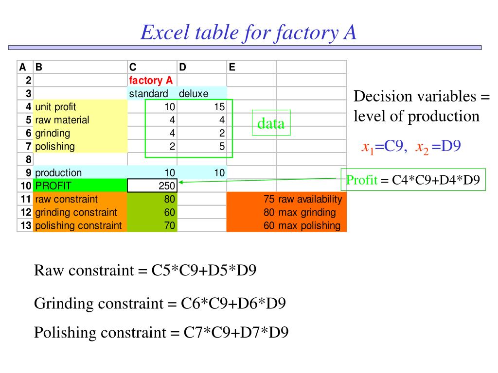 Decision variables = level of production data x1=C9, x2 =D9 Profit = C4*C9+D4*D9 Raw constraint = C5*C9+D5*D9 Grinding constraint = C6*C9+D6*D9 Polishing constraint = C7*C9+D7*D9 Excel table for factory A
