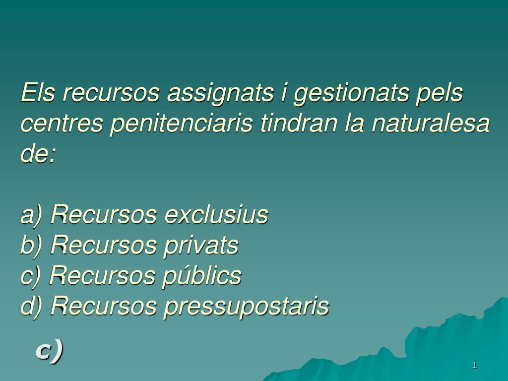 Els recursos assignats i gestionats pels centres penitenciaris tindran la naturalesa de: a) Recursos exclusius b) Recursos privats c) Recursos públics d) Recursos pressupostaris. c) .