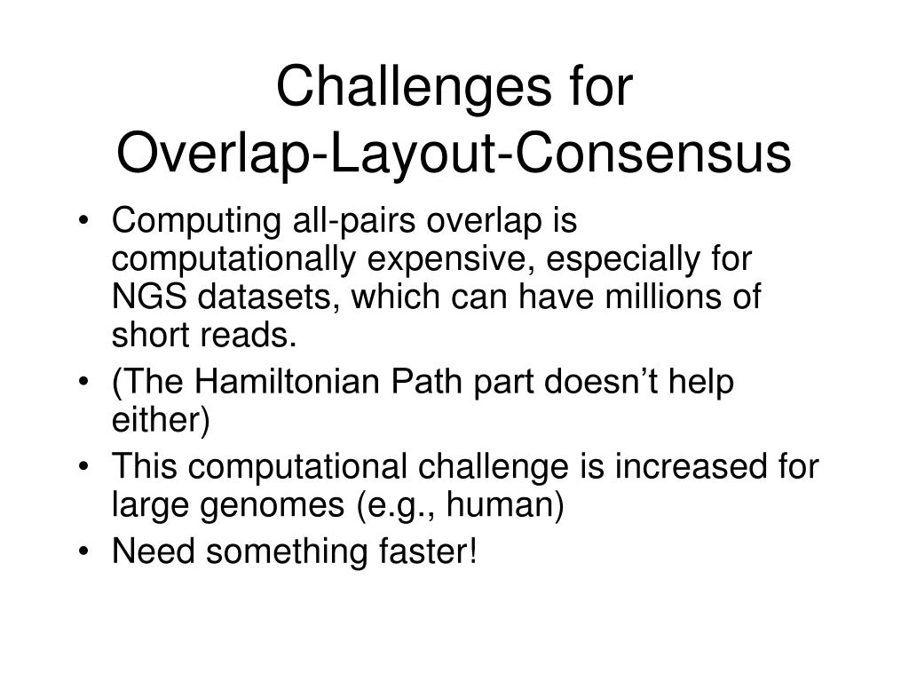 Challenges for Overlap-Layout-Consensus • Computing all-pairs overlap is computationally expensive, especially for NGS datasets, which can have millions of short reads. • (The Hamiltonian Path part doesn’t help either) • This computational challenge is increased for large genomes (e.g., human) • Need something faster!