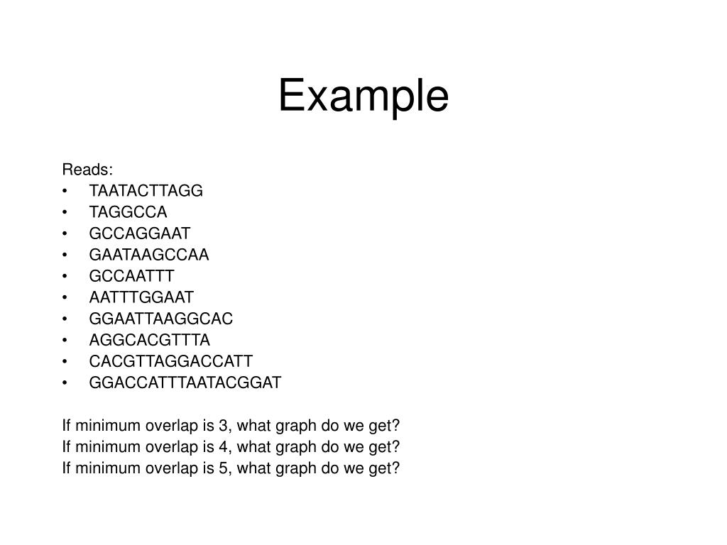 Example Reads: • TAATACTTAGG • TAGGCCA • GCCAGGAAT • GAATAAGCCAA • GCCAATTT • AATTTGGAAT • GGAATTAAGGCAC • AGGCACGTTTA • CACGTTAGGACCATT • GGACCATTTAATACGGAT If minimum overlap is 3, what graph do we get? If minimum overlap is 4, what graph do we get? If minimum overlap is 5, what graph do we get?