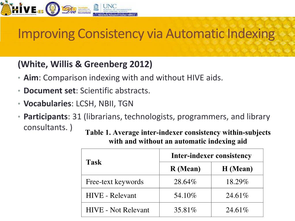 (White, Willis & Greenberg 2012) Aim: Comparisonindexingwith and without HIVE aids. Document set: Scientificabstracts. Vocabularies: LCSH, NBII, TGN Participants: 31 (librarians, technologists, programmers, and libraryconsultants. ) ImprovingConsistencyviaAutomaticIndexing