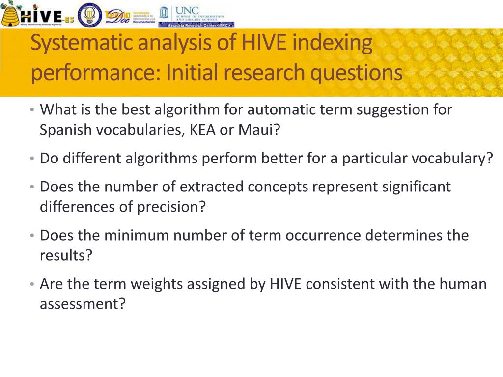 What is the best algorithm for automatic term suggestion for Spanish vocabularies, KEA or Maui? • Do different algorithms perform better for a particular vocabulary? • Does the number of extracted concepts represent significant differences of precision? • Does the minimum number of term occurrence determines the results? • Are the term weights assigned by HIVE consistent with the human assessment? Systematicanalysis of HIVE indexing performance: Initial research questions