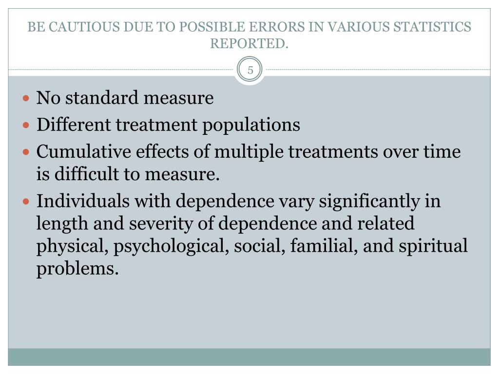 BE CAUTIOUS DUE TO POSSIBLE ERRORS IN VARIOUS STATISTICS REPORTED. • No standard measure • Different treatment populations • Cumulative effects of multiple treatments over time is difficult to measure. • Individuals with dependence vary significantly in length and severity of dependence and related physical, psychological, social, familial, and spiritual problems.