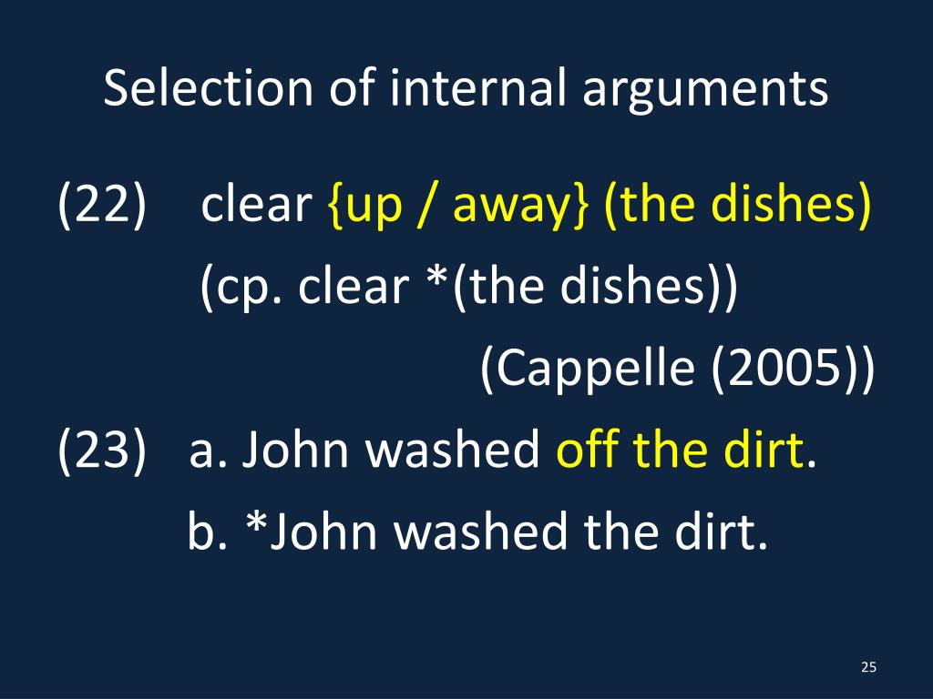 Selection of internal arguments • clear {up / away} (the dishes) (cp. clear *(the dishes)) (Cappelle (2005)) (23) a. John washed off the dirt. b. *John washed the dirt.