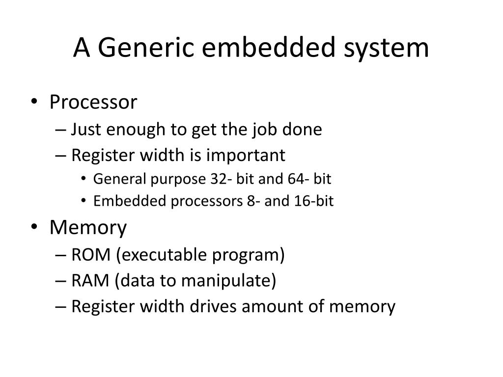 A Generic embedded system • Processor • Just enough to get the job done • Register width is important • General purpose 32- bit and 64- bit • Embedded processors 8- and 16-bit • Memory • ROM (executable program) • RAM (data to manipulate) • Register width drives amount of memory