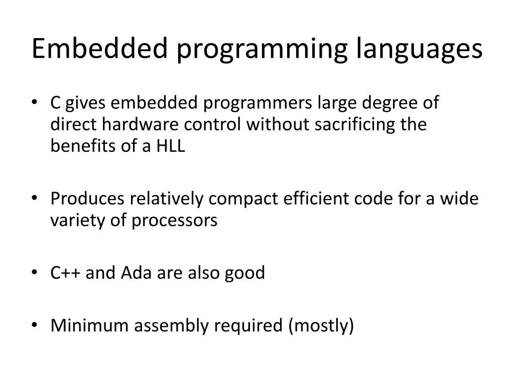 Embedded programming languages • C gives embedded programmers large degree of direct hardware control without sacrificing the benefits of a HLL • Produces relatively compact efficient code for a wide variety of processors • C++ and Ada are also good • Minimum assembly required (mostly)