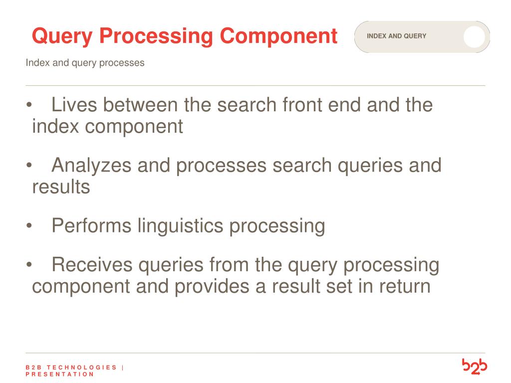 Query Processing Component Index and query Index and query processes • Lives between the search front end and the index component • Analyzes and processes search queries and results • Performs linguistics processing • Receives queries from the query processing component and provides a result set in return B2B TECHNOLOGIES | PRESENTATION