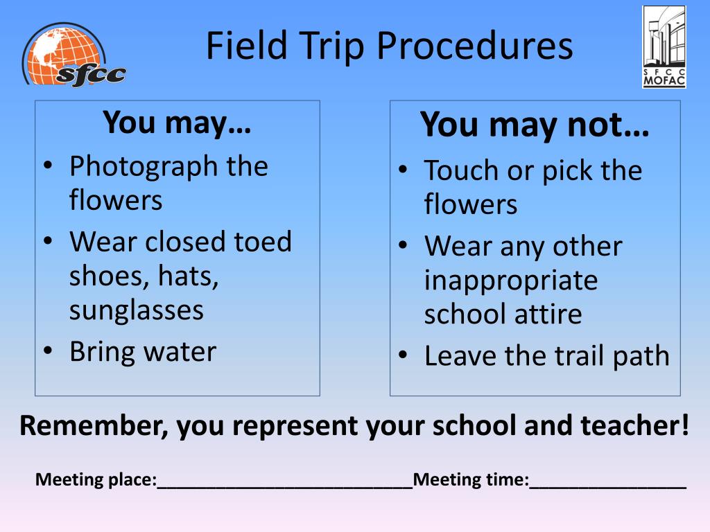 Field Trip Procedures You may not… • Touch or pick the flowers • Wear any other inappropriate school attire • Leave the trail path You may… • Photograph the flowers • Wear closed toed shoes, hats, sunglasses • Bring water Remember, you represent your school and teacher! Meeting place:__________________________Meeting time:________________