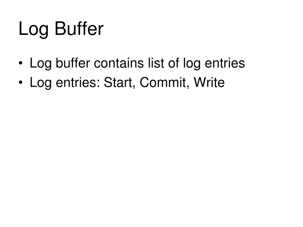 Log Buffer • Log buffer contains list of log entries • Log entries: Start, Commit, Write