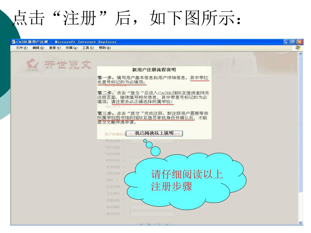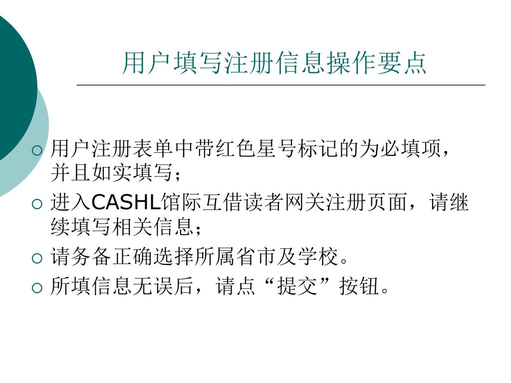 用户填写注册信息操作要点 • 用户注册表单中带红色星号标记的为必填项,并且如实填写; • 进入CASHL馆际互借读者网关注册页面,请继续填写相关信息; • 请务备正确选择所属省市及学校。 • 所填信息无误后,请点“提交”按钮。