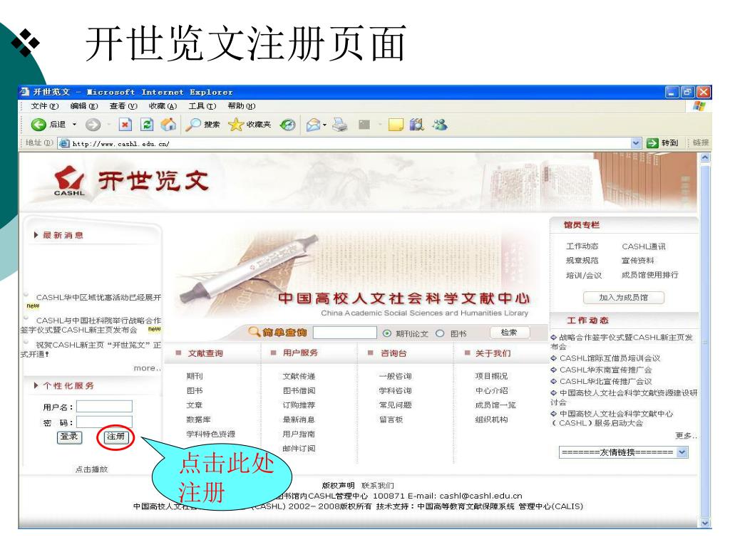 读者注册CASHL用户,可按以下步骤进行: 2. 读者注册成为CASHL正式用户 • 登录开世览文主页(http://www.cashl.edu.cn)点击个性化服务下 “注册” • CASHL中心读者网关(http://ill.cashl.edu.cn/gateway/) 点击 “注册”