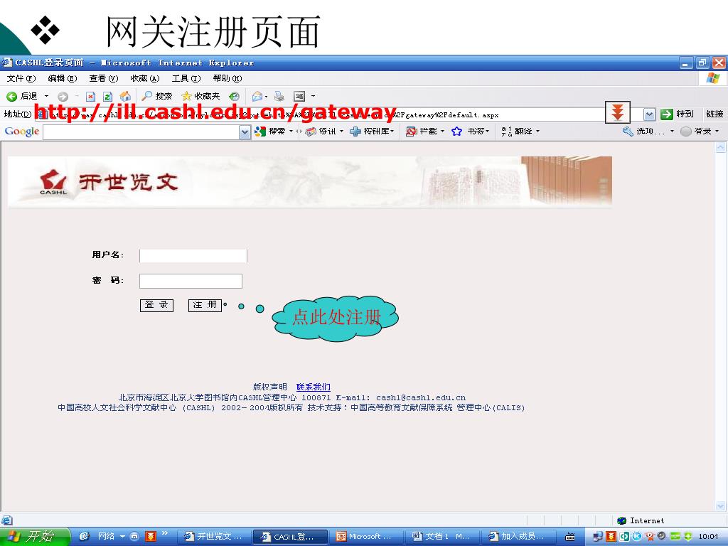 网关注册页面 http://ill.cashl.edu.cn/gateway 点此处注册 点击此处注册 注册网址