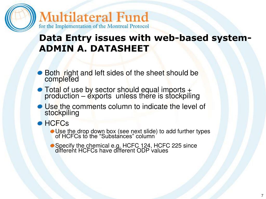 Data Entry issues with web-based system-ADMIN A. DATASHEET • Both right and left sides of the sheet should be completed • Total of use by sector should equal imports + production – exports unless there is stockpiling • Use the comments column to indicate the level of stockpiling • HCFCs • Use the drop down box (see next slide) to add further types of HCFCs to the “Substances” column • Specify the chemical e.g. HCFC 124, HCFC 225 since different HCFCs have different ODP values