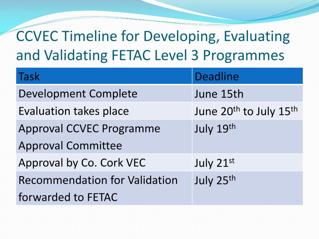 CCVEC Timeline for Developing, Evaluating and Validating FETAC Level 3 Programmes
