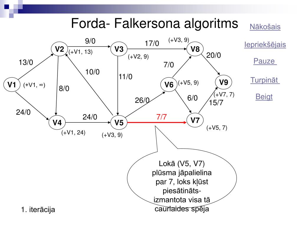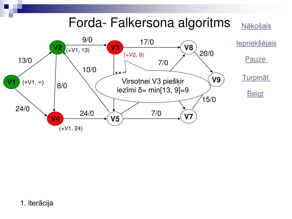 Forda- Falkersona algoritms Nākošais 9/0 17/0 Iepriekšējais V2 V3 V8 (+V1, 13) 20/0 Pauze 13/0 7/0 10/0 11/0 Turpināt V9 V1 V6 (+V1, ∞) 8/0 Beigt 6/0 26/0 15/0 24/0 24/0 7/0 V7 V4 V5 (+V1, 24) Virsotne V1 tiek iekrāsota zaļa, jo tā ir iezīmēta un caurskatīta 1. iterācija