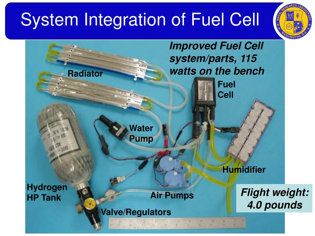 System Integration of Fuel Cell Improved Fuel Cell system/parts, 115 watts on the bench Radiator Fuel Cell Water Pump Humidifier Hydrogen HP Tank Flight weight: 4.0 pounds Air Pumps Valve/Regulators