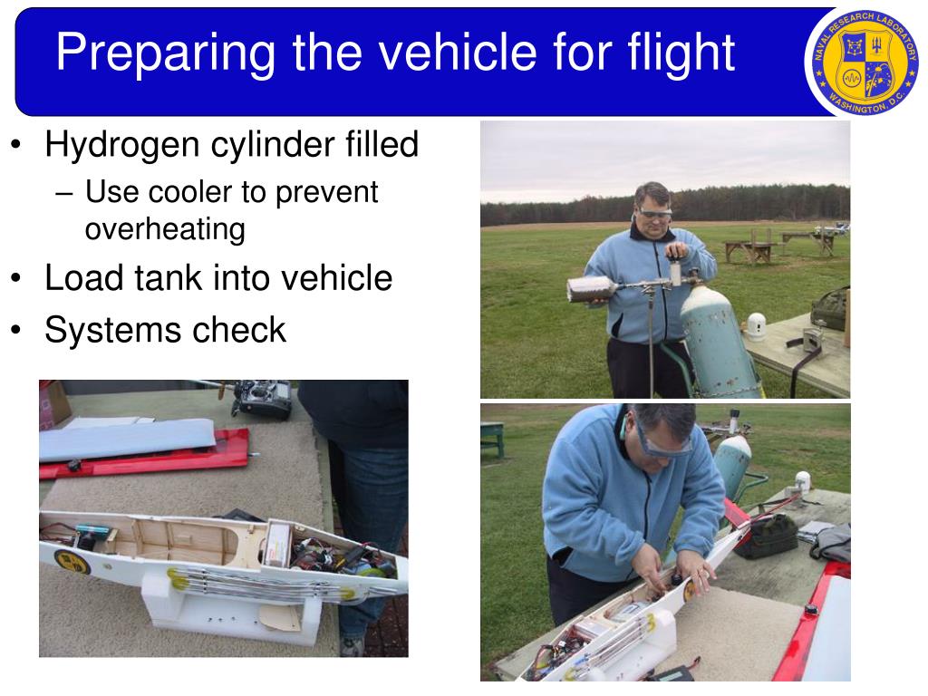 Preparing the vehicle for flight • Hydrogen cylinder filled • Use cooler to prevent overheating • Load tank into vehicle • Systems check