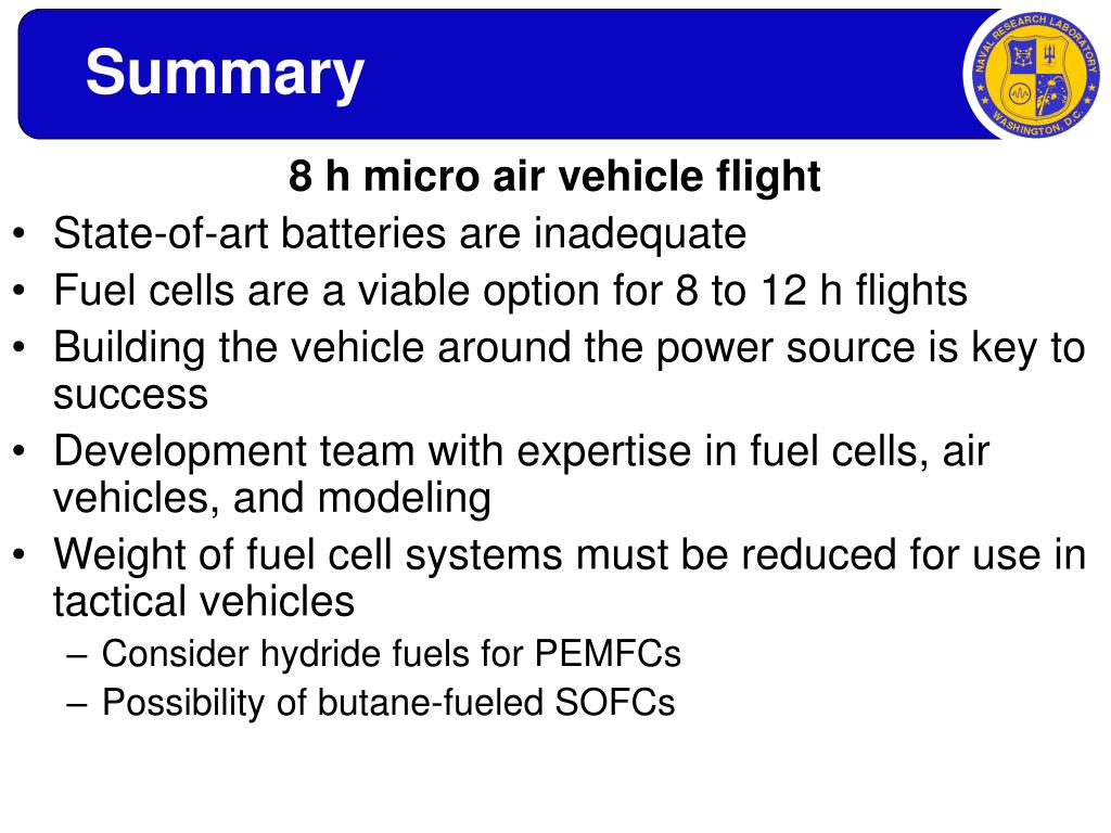 Summary 8 h micro air vehicle flight • State-of-art batteries are inadequate • Fuel cells are a viable option for 8 to 12 h flights • Building the vehicle around the power source is key to success • Development team with expertise in fuel cells, air vehicles, and modeling • Weight of fuel cell systems must be reduced for use in tactical vehicles • Consider hydride fuels for PEMFCs • Possibility of butane-fueled SOFCs