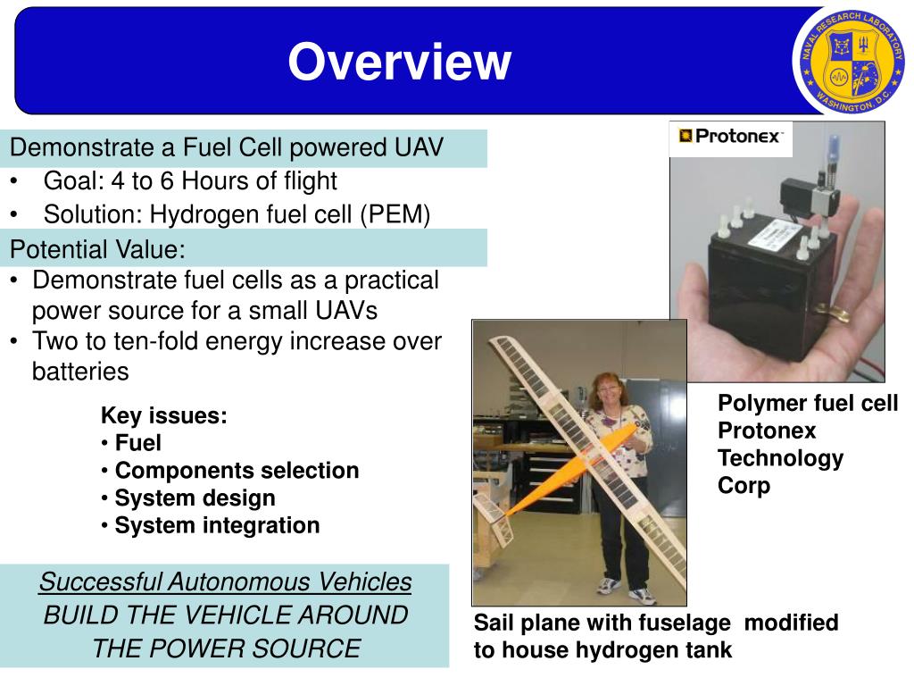 Demonstrate a Fuel Cell powered UAV Goal: 4 to 6 Hours of flight Solution: Hydrogen fuel cell (PEM) Overview • Potential Value: • Demonstrate fuel cells as a practical power source for a small UAVs • Two to ten-fold energy increase over batteries Polymer fuel cell Protonex Technology Corp • Key issues: • Fuel • Components selection • System design • System integration Successful Autonomous Vehicles BUILD THE VEHICLE AROUND THE POWER SOURCE Sail plane with fuselage modified to house hydrogen tank